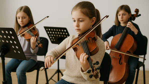 Im "Jungen Streichorchester" sammeln unsere Schüler:innen von Anfang an wertvolle Erfahrungen im gemeinsamen Musizieren. Hier lernen sie, aufeinander zu hören, miteinander zu gestalten und die Freude am Zusammenspiel zu entdecken.